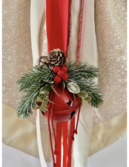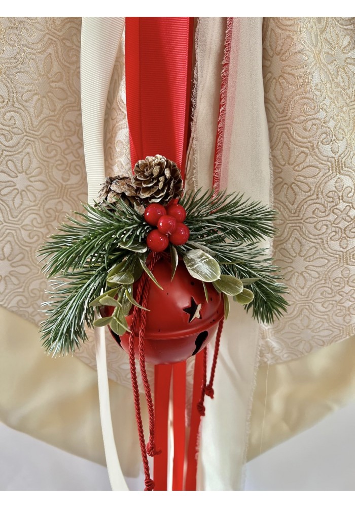 arricchito di nastri e nastrini in cotone di colore rosso o di colore verde. Completa il tutto con dettagli festivi come aghi di pino, bacche, palline e impreziosito da una magnifica sfera con sonagli all’interno.