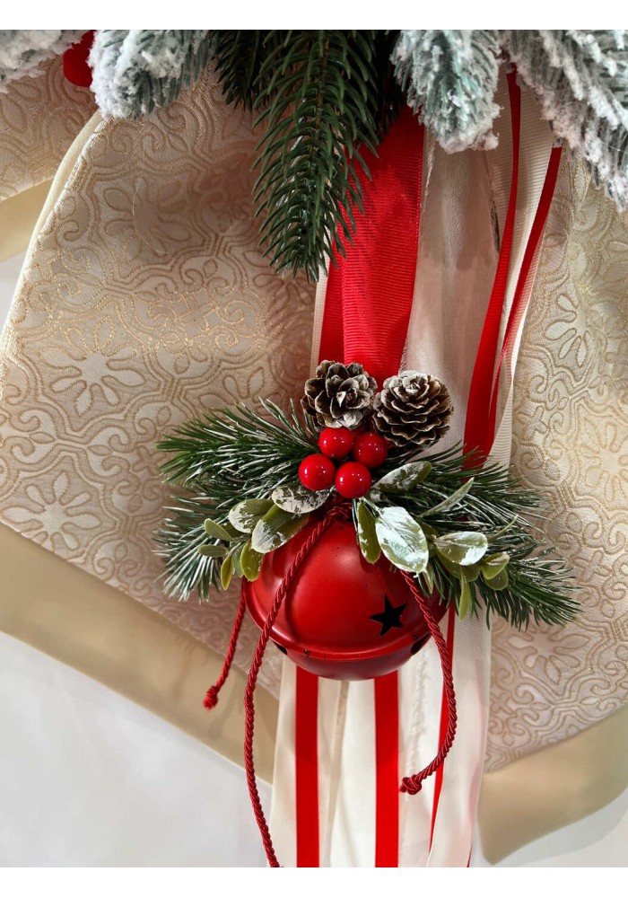 arricchito di nastri e nastrini in cotone di colore rosso o di colore verde. Completa il tutto con dettagli festivi come aghi di pino, bacche, palline e impreziosito da una magnifica sfera con sonagli all’interno.
